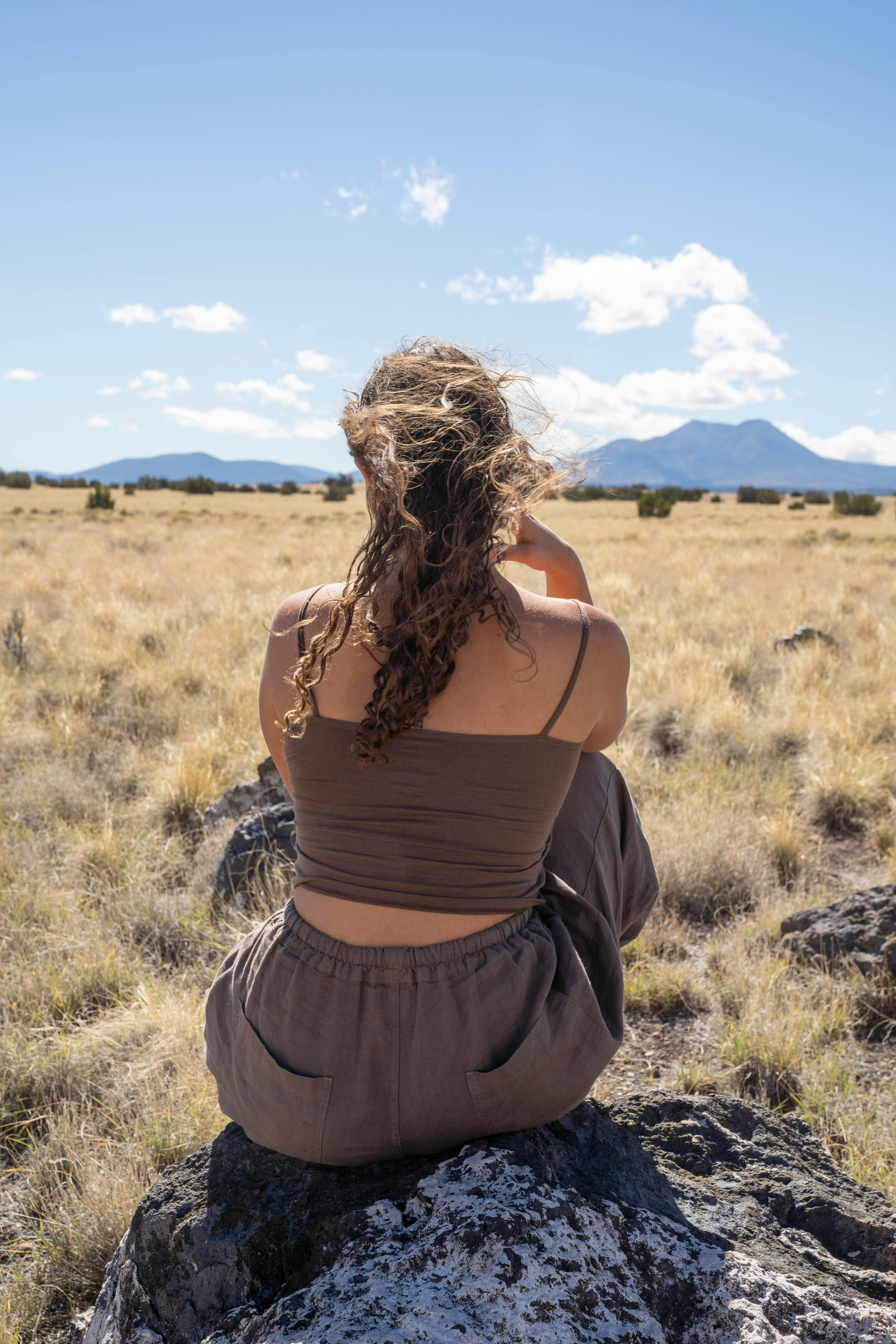 Perfectly straight and cropped, this top gives you stylish look of bandeau, but no worries of falling down with the slim straps. It has built in shelf bra for coverage but no elastic band on the ribcage - your ribcage can breath happily. It will become your favorite tank not just for mat, but for everywhere you go.